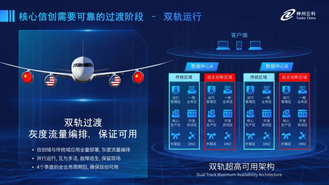 為幫助客戶更好地應對數(shù)字經(jīng)濟時代對應用可持續(xù)性的高要求,實現(xiàn)信創(chuàng)與數(shù)字化兼得,leyu.樂魚推出了雙軌超高可用架構(gòu)。雙軌超高可用架構(gòu)在雙活數(shù)據(jù)中心的分區(qū)調(diào)度基礎上,增加信創(chuàng)域和非信創(chuàng)域的分域調(diào)度,實行信創(chuàng)域與傳統(tǒng)域應用全量部署,使雙中心運營變?yōu)殡p中心四區(qū)域并行運行,互為多活,將傳統(tǒng)架構(gòu)變?yōu)榉謪^(qū)分域協(xié)同的多活雙軌超高可用架構(gòu)。幫助客戶在新架構(gòu)下,保障“信創(chuàng)”的同時解決性能瓶頸,提升穩(wěn)定性,保證應用可持續(xù)性,最終實現(xiàn)信創(chuàng)區(qū)域和非信創(chuàng)區(qū)域的平滑過渡,完成國產(chǎn)化替代目標?!?/p>