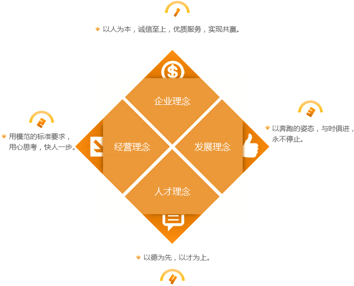 回報社會、構筑和諧。服務人民大眾,振興民族經濟;質量是企業(yè)的生命;顧客是完美的衣食父母;遵守國家法律,弘揚法制精神,伸張社會正義,爭做守法公民;爭創(chuàng)效益,回報社會;以人為本,以才興企,廣納賢才。