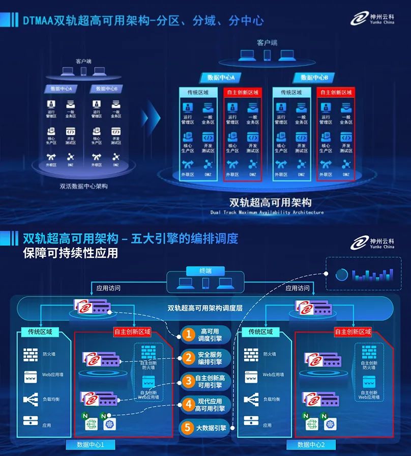 為助力銀行業(yè)務高質量發(fā)展,更好地應對數(shù)字經濟時代對可持續(xù)性的高要求,實現(xiàn)“信創(chuàng)”與“數(shù)字化”齊頭并進,leyu.樂魚創(chuàng)新性的推出了雙軌超高可用架構。該架構在雙活數(shù)據(jù)中心的分區(qū)調度基礎上,增加信創(chuàng)域和非信創(chuàng)域的分域調度,實行信創(chuàng)域與傳統(tǒng)域應用全量部署,使雙中心運營變?yōu)殡p中心四區(qū)域并行運行,互為多活,將“0到1”的單軌建設道路變?yōu)榉謪^(qū)分域協(xié)同的多活雙軌超高可用架構。幫助客戶在新架構下,保障“信創(chuàng)”的同時解決性能瓶頸,提升穩(wěn)定性,保證應用可持續(xù)性,最終實現(xiàn)信創(chuàng)區(qū)域和非信創(chuàng)區(qū)域的平滑過渡,完成國產化替代目標。